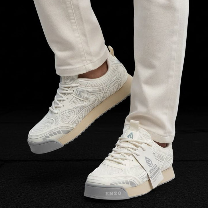 Introducing the Enzo Aura 'MILK'. Crafted with a lightweight mesh upper and detailed panel overlays, the Enzo Aura blends everyday wearability with a modern edge. This “Milk” colorway pairs soft neutrals with a layered texture that elevates any look — minimal, but far from basic.